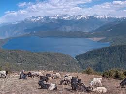 around the lake is dominated by blue pine (Pinus excelsa) up to 3200 m,
